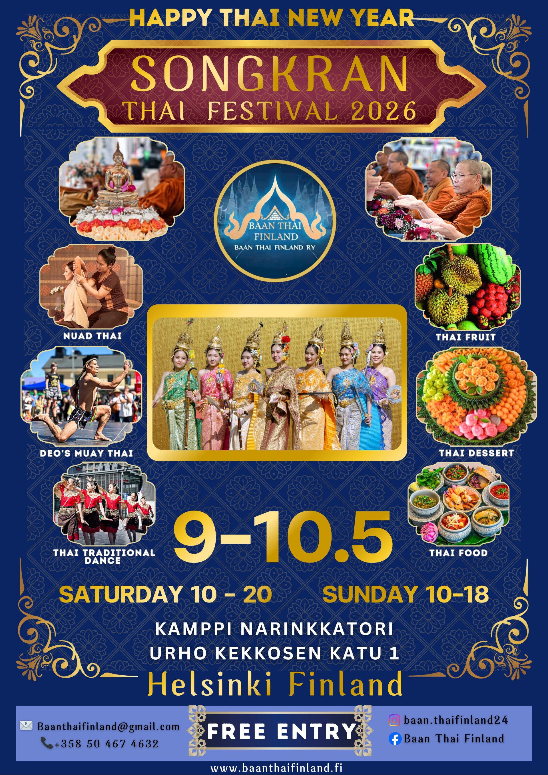 Songkran Festivaali, eli tunnetummin "vesijuhlat", on thaimaalaisen uuden vuoden riemukas juhla, joka tuo yhteen iloisen tunnelman, perinteet ja virkistävän veden. Vuonna 2025 tätä värikästä tapahtumaa vietetään Helsingissä, Kampin ulkopuolella olevalla vapaalla alueella 9-10. toukokuuta alkaen kello 10.00. Olipa kyseessä riemukas vesitaistelu, herkullinen thaimaalainen ruoka tai mahdollisuus tutustua Thaimaan kulttuuriin, tämä päivä on täynnä elämyksiä koko perheelle.